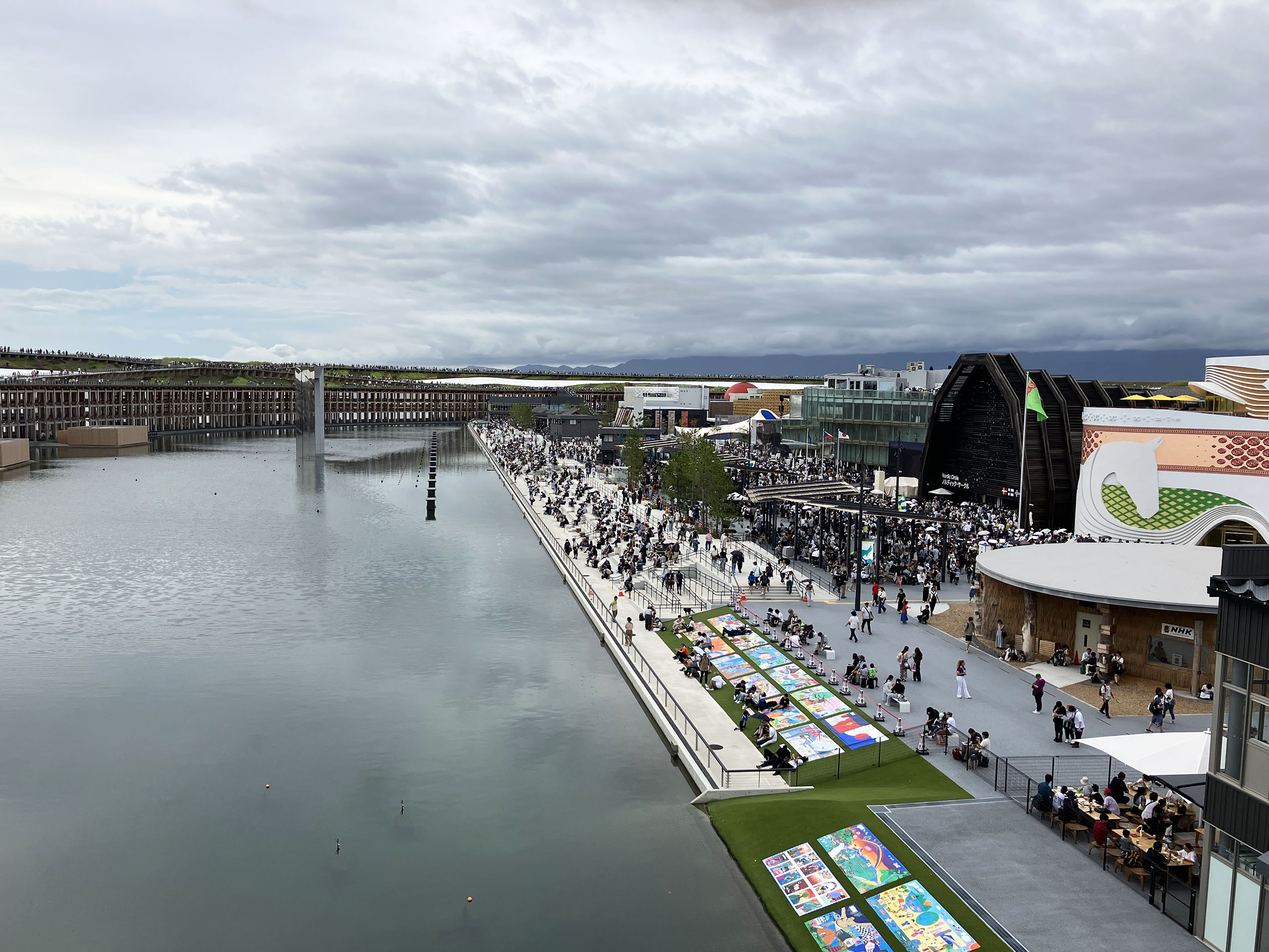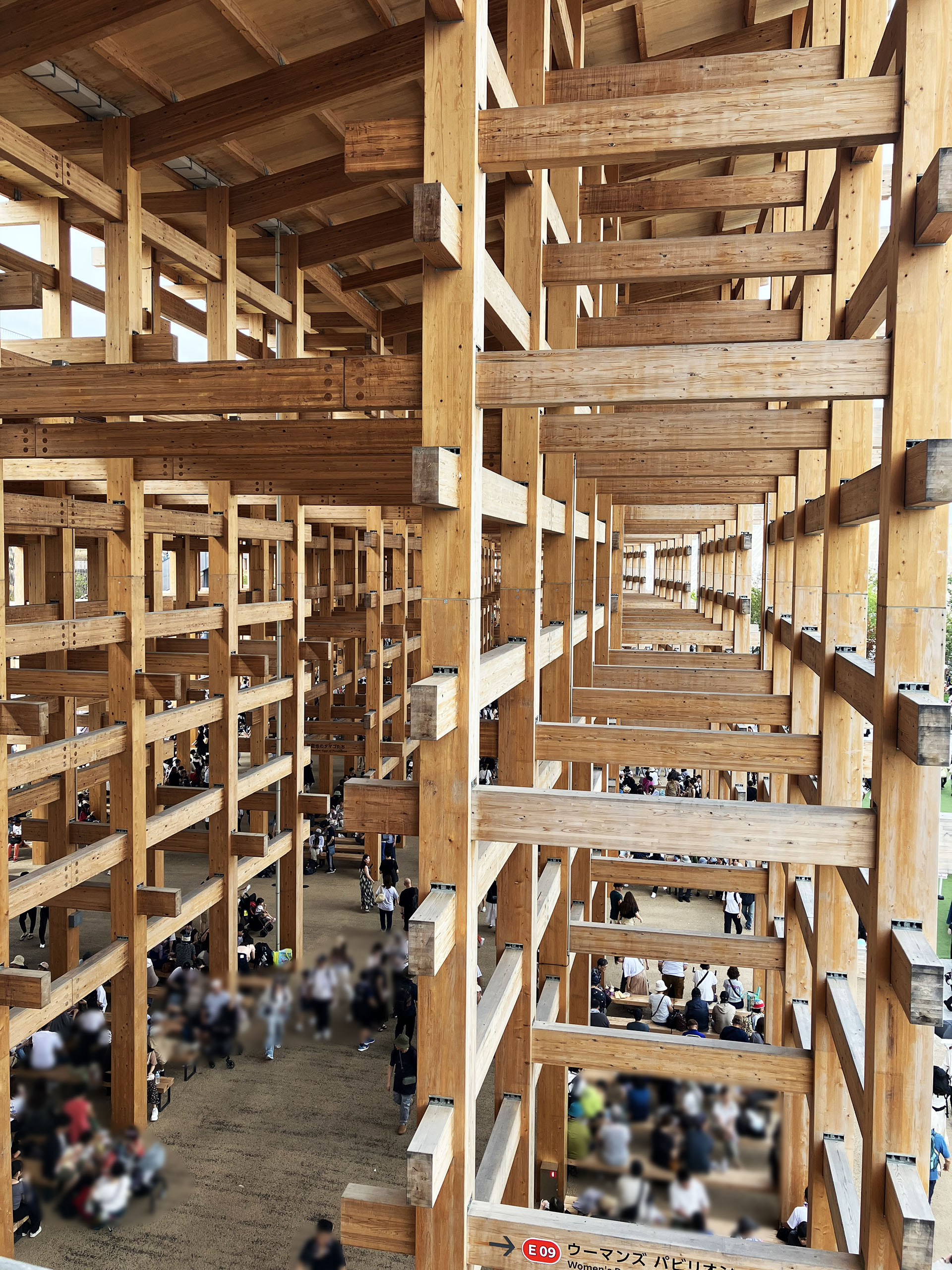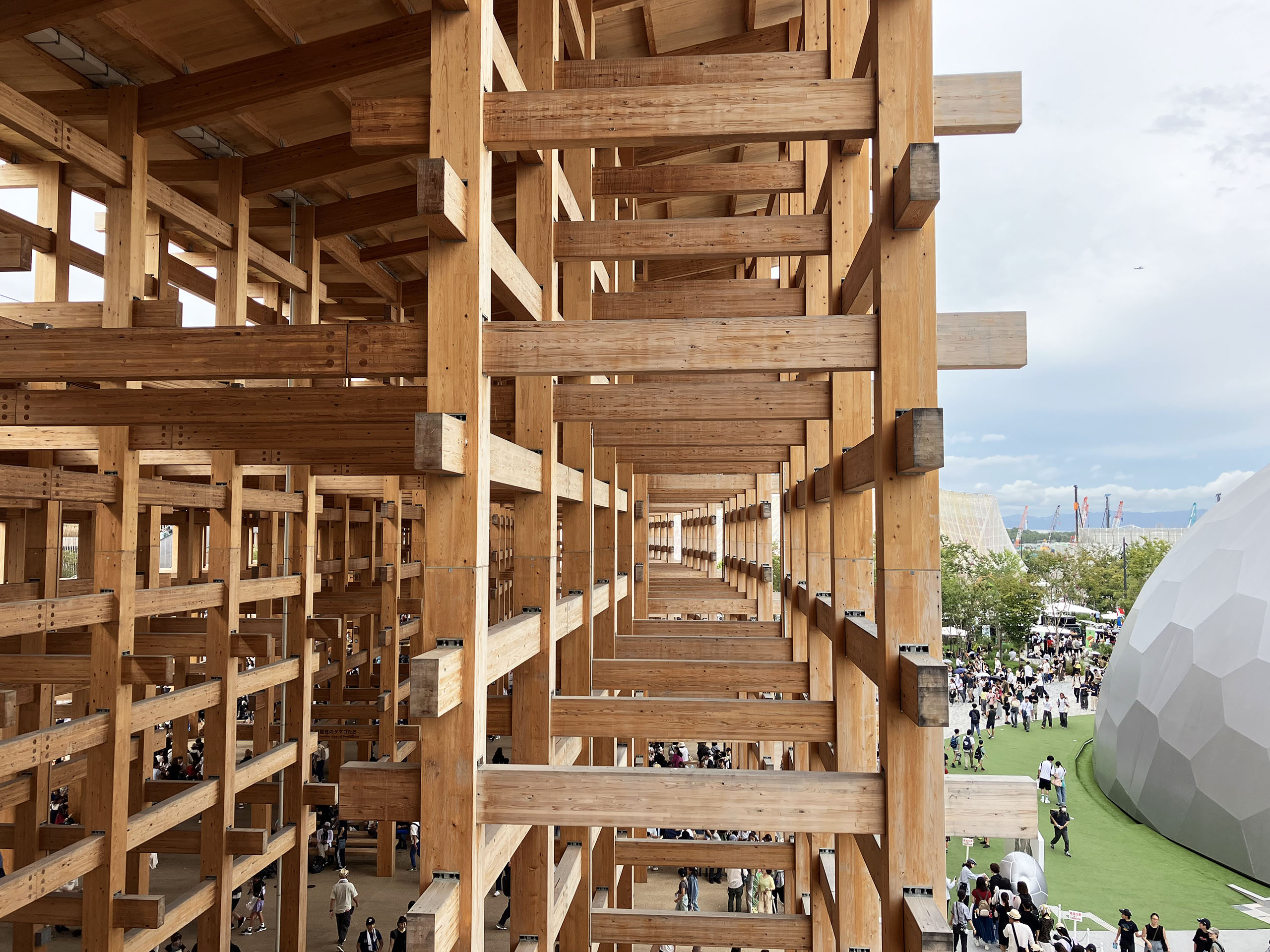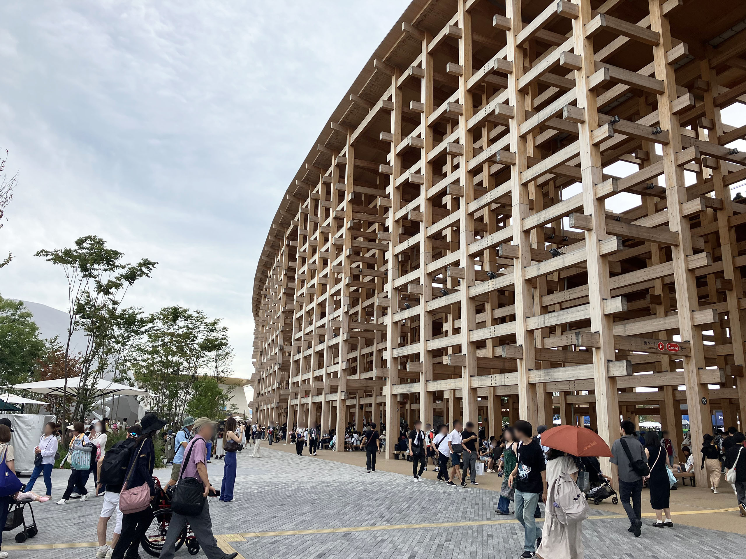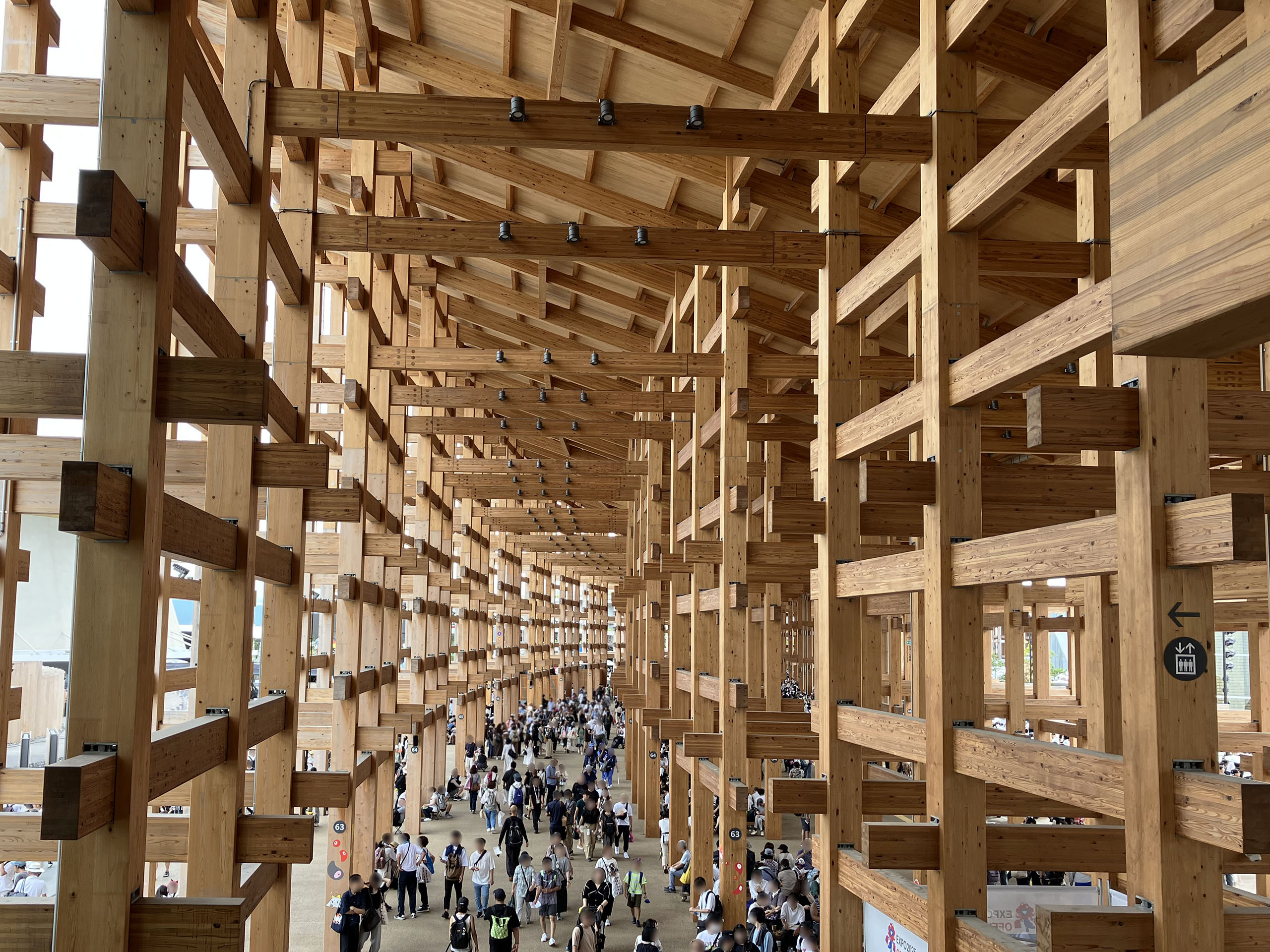 世界最大の木造建築としてギネスにも登録された大屋根リング。いざ会場に到着し、入場ゲートの大行列を1時間以上かかって突破、間近で見あげたそれは圧巻だった。「すごいね」「よく作ったね」と感心しながら眺めたり通路を歩いたりした。